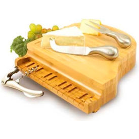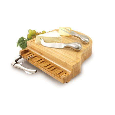 This lovely Piano cheese board/tool set from Picnic Time has a stunning design made of rich bamboo shaped like a baby grand piano, complete with an engraved keyboard and prop stick to hold the piano lid in place. Prop open the lid to reveal the brushed stainless steel tools inside and a beautiful brass toned piano hinge. The brushed stainless steel tools include a cheese fork and two pronged cheese knife, along with a stainless steel corkscrew, and provide the finishing touches to this one-of-a-kind premium entertaining set. This set truly makes a wonderful gift for pianists, music enthusiasts, and those who love owning items that are uniquely novel and fun to share with guests. Measures 9 by 9 by 2-3/4 inches.