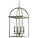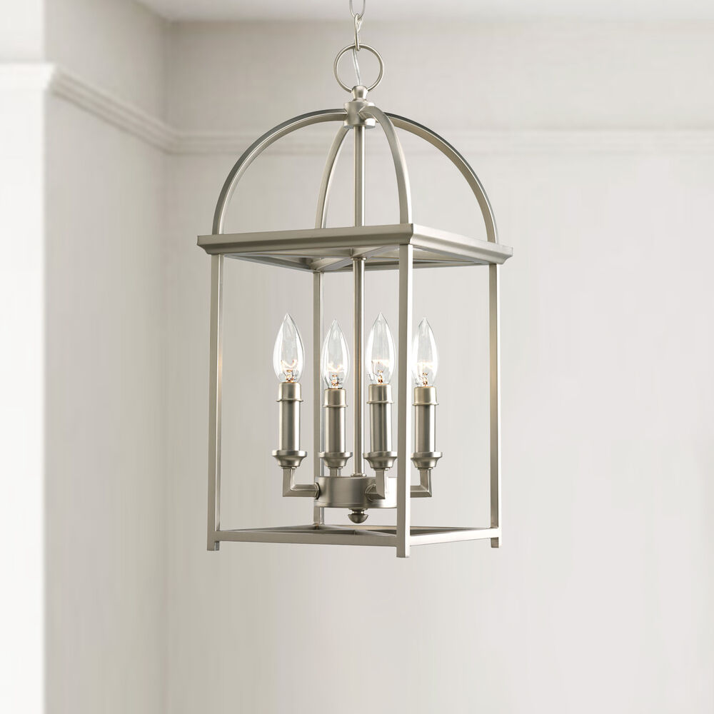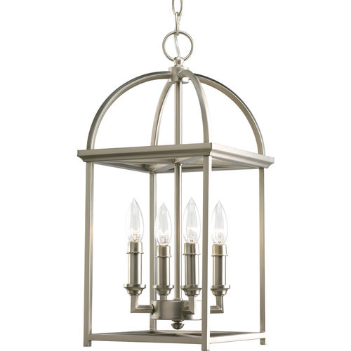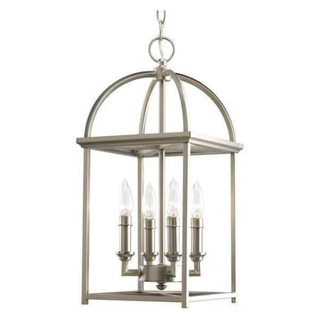 Four-light foyer lantern with soaring arches and candle chaser accents. Simple vertical structure with open arching roof and center inspired by classic shaker design. Bulbs Included: FALSE Product Weight: 5 Product Color: Grey Lamp Wattage: 60 Glass: Matching candle covers and caps Weight: 5 Notes:
