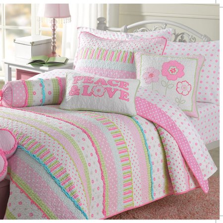 This exquisitely fun bold bright colorful patterned fabrics in floral, polka dot, stripe, and plaids all quilted together in a stripe pattern and adorn with several designer ruffles will surely bring a pop of color to any room. Rather you want to refresh your bedroom, a child’s room or a guest room you will be pleased. Quilt set is crafted of 100% Cotton. Offered in Twin and Queen. Coordinating accessories also available for purchase separately Décor Throw Pillows, Complete Sheet Sets, Window Curtains and Window Valance. The quilt is reversible. With its easy-care machine-washable cotton material, this quilt set is easy and quick to launder.