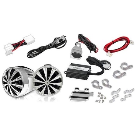 | Feature | 350 Watts x 2 Channels Micro Amplifier with wire harness - Pair of Chrome Handlebar Clamps - Easy Chrome Stainless Mounting Brackets and Accessories included - Bluetooth 3.0 technology - Speaker Dimensions : 4.8"L x 3.35"W x 3.35"H |