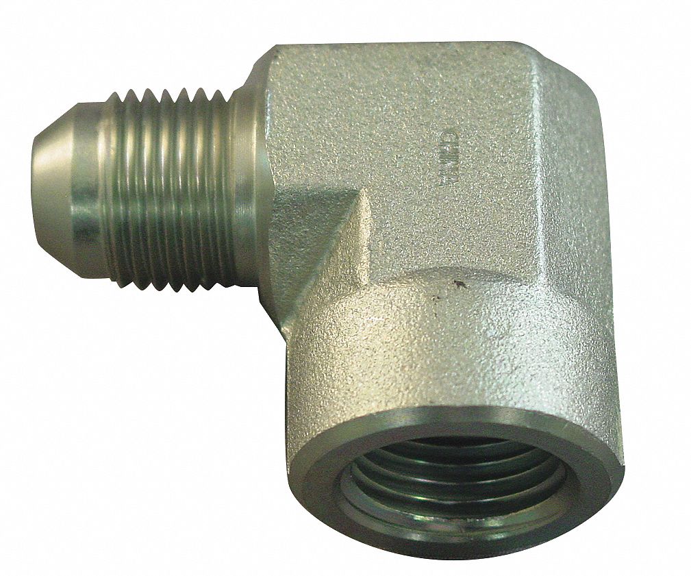 - 90-degree female Joint Industry Council (JIC) elbow to connect to an National Pipe Thread (NPT) male thread at a 90-degree angle