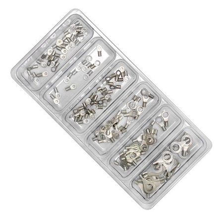 AMP SOLISTRAND TERMINAL KIT; Connector Kit Type:Terminals & Splices; Kit Contents:120-Pcs of 1/4, 2, 4, 6, 8, 10 Stud Size Uninsulated Ring Tongue Terminals; Product Range:SOLISTRAND Series RoHS Compliant: Yes