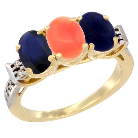 14K Yellow Gold Natural Blue Sapphire, Coral & Lapis Ring 3-Stone Oval 7x5 mm Diamond Accent, sizes 5 - 10