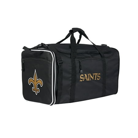 Officially licensed duffle bag, Size: 12"H x 28"Lx 11"W, Front and side pockets, Detachable and adjustable cross body, Compacts down to 12" x 11" x 1.25" for easy travel stowing and storage, Made of 600D polyester, Spot clean only
