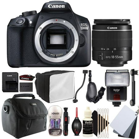 The <b>Canon EOS 1300D</b> captures beautiful images in an affordable package. With an 18 megapixel sensor, 3 inch TFT LCD monitor, and Full HD 1080p video, its the perfect camera to begin your journey into DSLR photography. <br /> <br />The EOS 1300D is an ideal camera for those looking to get into digital SLR photography, and the addition of Wi-Fi and NFC makes it an obvious choice for novice and intermediate photographers. It features everything you need to get started, and you can add extra lenses and accessories as your skill and confidence improves. <br /> <br />This listing includes the following: <ul> <li>18-55mm + Vivitar SF-4000 Bounce Slave Flash + Flash Diffuser + Flexible Flash + White Balance Grey Cards + DSLR Grip Strap + Gadget Bag + Rechageable AA Batteries + Lens Pen + Dust Blower + 3pc Cleaning Kit</li> </ul>
