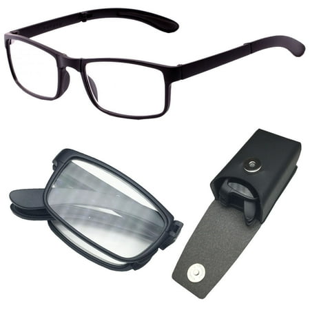 Folding Reading Glasses Plastic Frame Plastic Lens Clear Lens Width: 135 mm Height: 35 mm Lens width: 52 mm Bridge: 15 mm Arm: 130 mm Comes with pleather hard case, with a snap back belt clip Great for both men and women