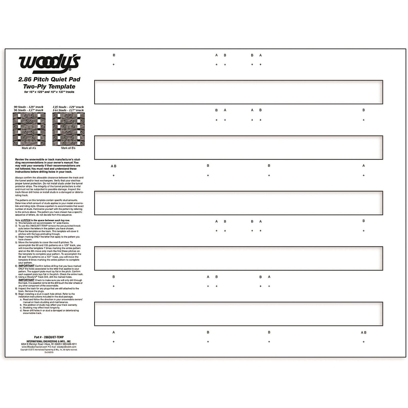 Stud patterns on Woodystemplates are CAD-designed to maintain track balance.<br> Follow the instructions and you will have the highest level of precision stud placement.<br> Printed on laminated heavy card stock unless noted.<br> Track Pitch: 2.86.<br> Track Length: 129in..<br> Track Width: 16in..<br> Track Ply: Simple