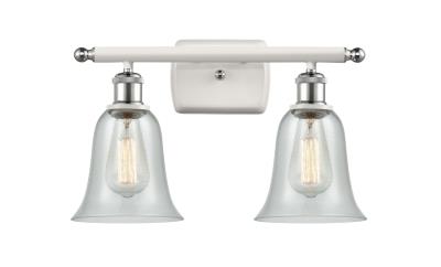 INNOVATIONS LIGHTING 516-2W-WPC-G2812 Hanover 2 Light Bath Vanity Light part of the Ballston Collection. The Hanover 2 Light Bath Vanity Light is part of the Ballston Collection. Collection: Ballston. Material: Steel, Cast Brass, Glass. Accent Color: Polished Chrome. Metal Finish(Body): White and Polished Chrome. Metal Finish(Canopy/Backplate): White. Dimension(in): 16(W) x 13(H) x 7.5(Ext). Bulb: (2)100 Medium Base Vintage Bulb recommended(Not Included). Voltage: 120. Glass: Fishnet Hanover/Colorful. Shade Shape: Bell. Shade Material: Glass. Shade Size(in): 6.25 X 8. Shade Fitter Measurement: Neckless with a 2.125 inch Hole. Backplate Dimension(in): 4.5x6x0.75. Fixture can be hung with bulbs facing up or down. UL/CUL Damp Rated. Warranty: 2 Year Finish, Lifetime Electrical.