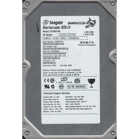 Seagate Barracuda ATA IV Model: ST340016A 40GB IDE HDD 3.5" PN:9T6002-132 ====================== HDD SN: 3HS9M7YY SN: SG-09P516-12536-2A6-M7YY FIRMWARE 3.75 ----------------------------------- 16,383 Cyl, 16heads, 63 Sectors, 78,165,360 LBA Date code: 03152, HDA P/N: 9T6002-132, CONFIG CODE: SWK-03, SITE CODE: AMK Desktop Parts, Desktop/Server hard drive, Very Reliable 40pin ide drive. THIS IS A WELL TESTED AND FORMATTED HARD DISK DRIVE. A GREAT PIECE FOR GREAT OPERATIONS! WORTH YOUR MONEYS WORTH.