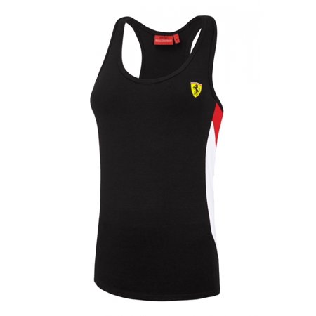 Ferrari Ladies Racer Back Tank Top. Racer back tank top with side contrast panels. Scudetto badge on the left chest. 95% Cotton / 5% Elastane. Made in Pakistan.