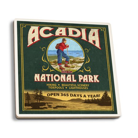 Lantern Press Acadia National Park, Maine - Vintage Hiker Sign (Set of 4 Ceramic Coasters - Cork-Backed, Absorbent)