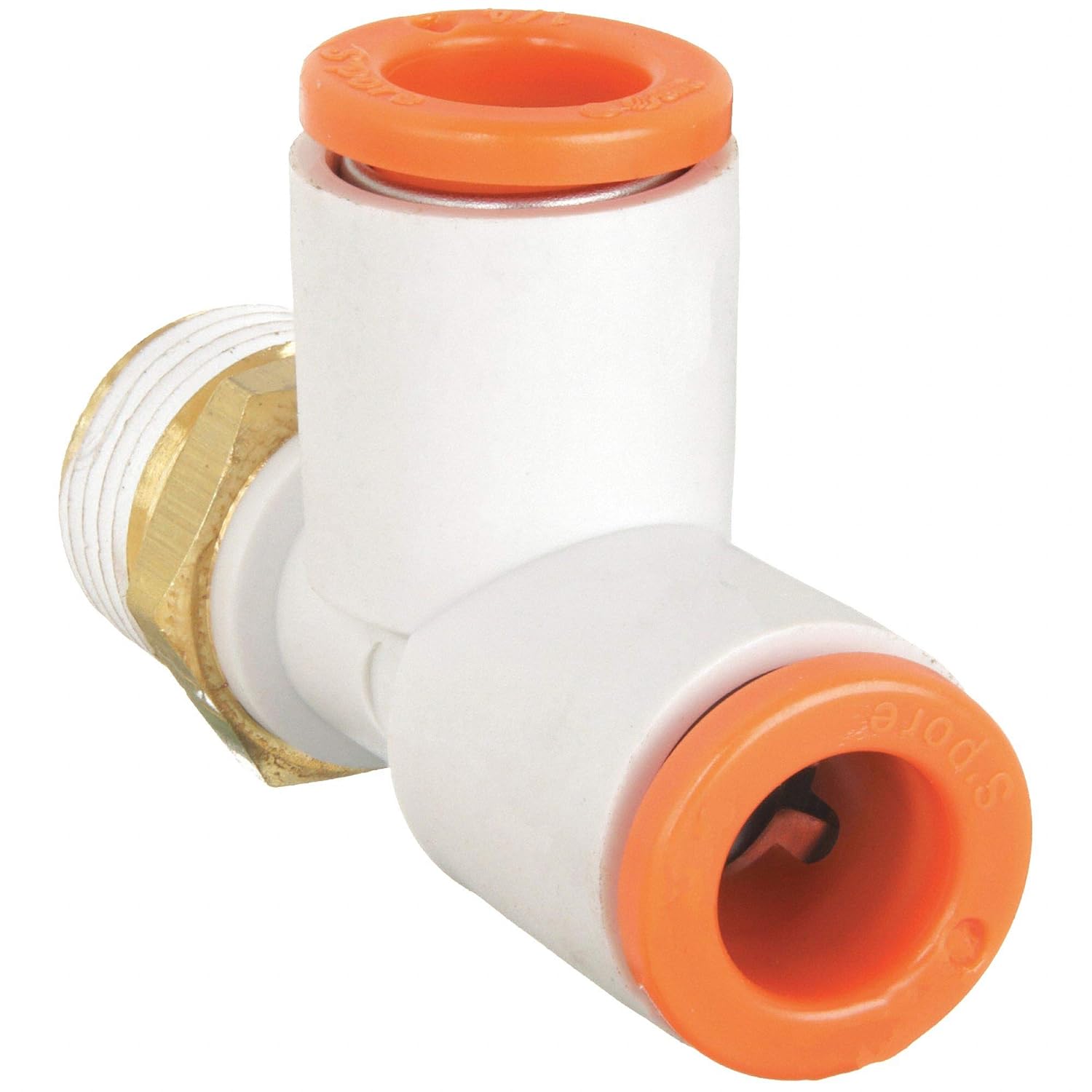 - <b>Price For:</b> Each <b>Pipe Size</b>: 1/4 <b>Temp. Range</b>: 23 Degrees to 140 Degrees F <b>Hex Size</b>: 9/16 <b>Color</b>: White/Gray <b>Max. Pressure</b>: 145 psi <b>Item</b>: Male Run Tee <b>Standards</b>: RoHs <b>Connection Type</b>: Tube x MNPT <b>Tube Size</b>: 3/16 <b>Basic Material</b>: Plastic <b>Fittings Sub-Category</b>: Tees <b>Body Material</b>: Polybutylene Terephthalate <b>Country of Origin (subject to change)</b>: Singapore