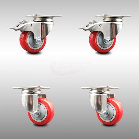3.5 Inch 316SS Red Polyurethane Wheel Swivel Top Plate Caster Lock Brake, 2PK