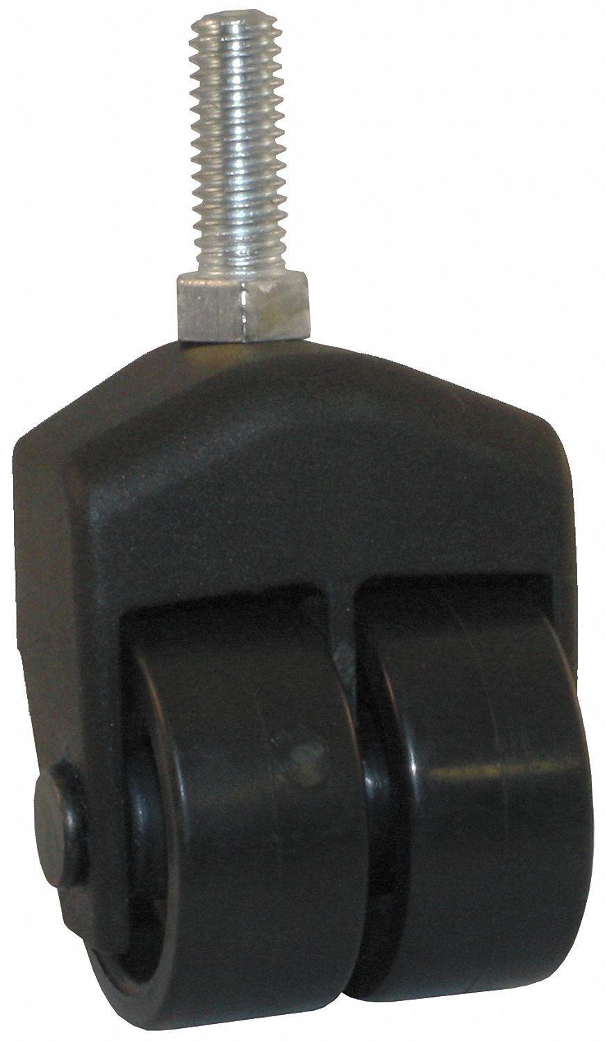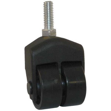 1-1/2" X 3/4" DUAL WHEEL BLACK COMPOSITE DISPLAY CASTER BODY <br> TWO 1-1/2" X 3/4" PP WHEELS <br> 3/8-16 X 1" THREADED STEM <br> 1/2" HEX NUT AT BASE
