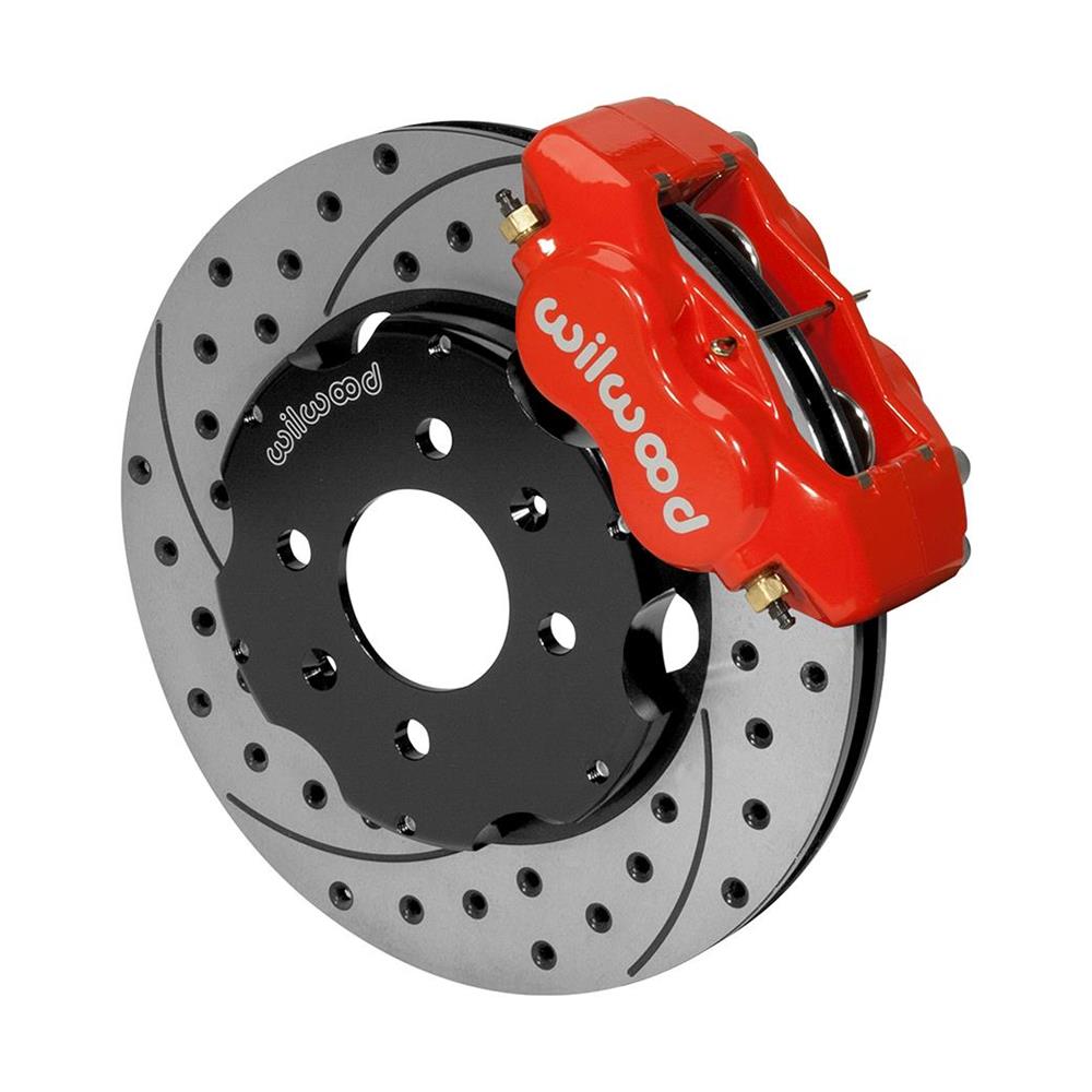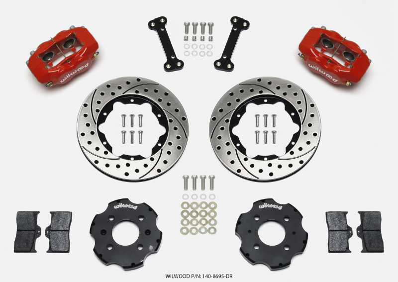 - Brand New Wilwood Premium Big Brake Forged Dynalite Bolt-On Front Hat and 11" Disc Brake Kit (Part # 140-8695-DR) for Both Front Wheels. | * Only one side pictured. See the list, the diagram, and the assembly booklet below for a detail of the parts included. | * Features Drilled and Slotted Rotors with Red Calipers.