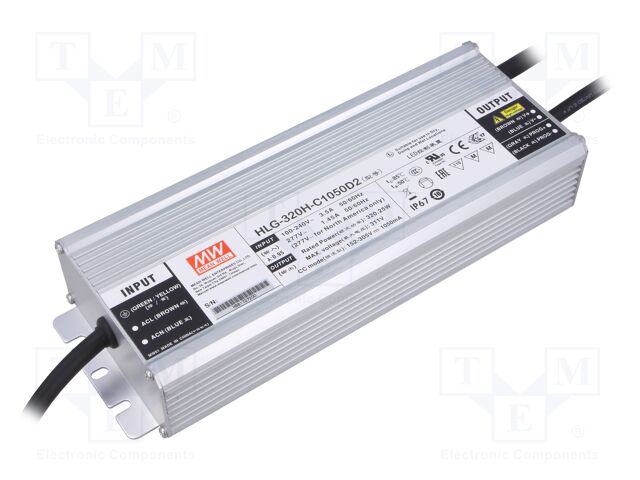 Buy HLG-320H-C1050D2 MEANWELL AC-DC Single output LED driver Constant current (CC) with built-in PFC, Output 305VDC / 1.05A, IP67, built-in smart timer dimmi..