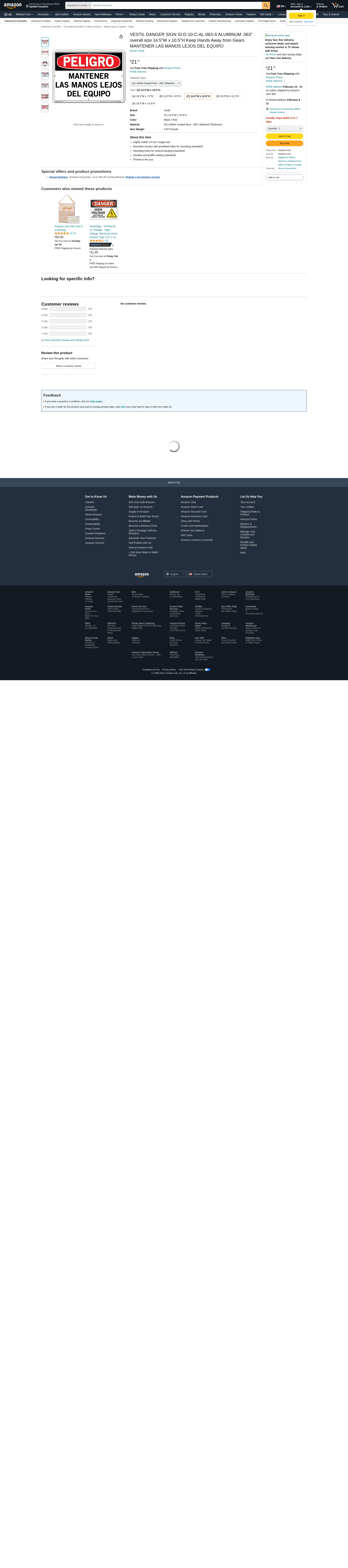 VESTIL DANGER SIGN SI-D-10-C-AL-063-S ALUMINUM .063" overall size 14.5"W x 10.5"H Keep Hands Away from Gears MANTENER LAS MANOS LEJOS DEL EQUIPO