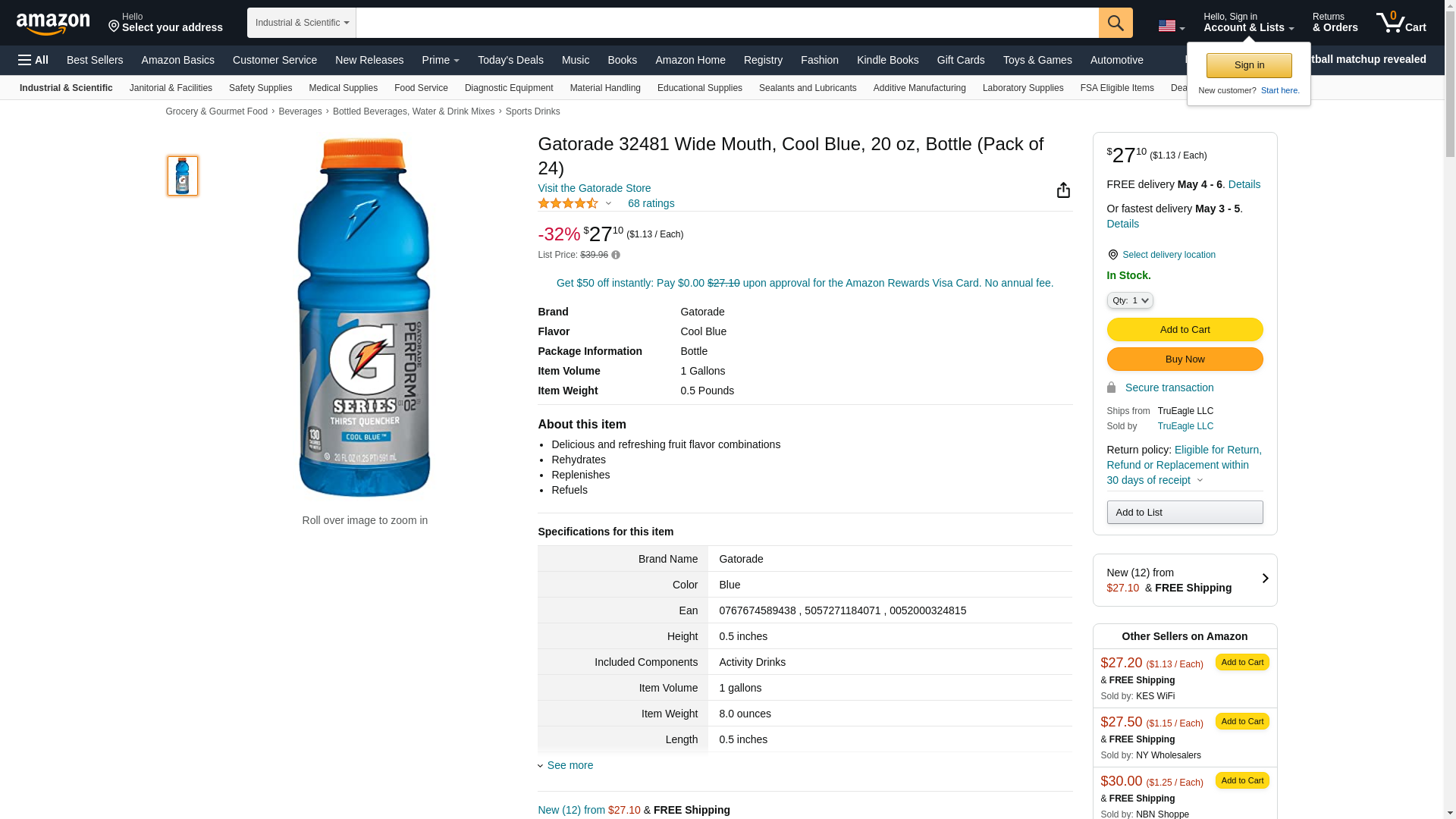 Gatorade 32481 Wide Mouth, Cool Blue, 20 oz., Bottle (Pack of 24)