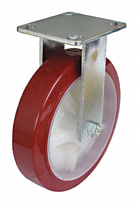 Item:Kingpinless Plate Caster; Caster Sub-Type:Rigid; Load Rating:770 Lb; Wheel Dia.:6 In; Wheel Width:2 In; Mounting Height:7 1/2 In; Wheel/Tread Material:Polyurethane; Wheel/Tread Hardness Rating:Hard; Wheel/Tread Hardness:55 Shore D; Wheel/Tread Color:Red; Wheel Bearing Type:Precision Ball; Swivel Radius:None- Rigid Caster; Mounting Plate Bolt Hole Pattern:B; Mounting Plate Size:4 In X 4 1/2 In; Inside Bolt Hole Spacing:3 In X 3 In; Outside Bolt Hole Spacing:2-5/8 In X 3-5/8 In; Mounting Bolt Dia.:3/8 In; Number Of Mounting Holes:4; Swivel Lock Type:No Lock Included; Caster Brake Type:No Brake Included; Frame Finish:Zinc Plated; Caster Frame Material:Steel; Tread Shape:Standard; Includes Thread Guards:No; Wheel Core Material:Polyurethane; Core Color:White; Non-Marking:Yes; Number Of Wheels:1; Replacement Wheel:Blickle Series; Application:Dollies, Dough Troughs, Platform Trucks, Scrap Metal Carriers, Tooling Fixtures, Tow Line, Utility Carts; Features:Floor Protective; Standards:Icwm; Includes:Complete Caster;
