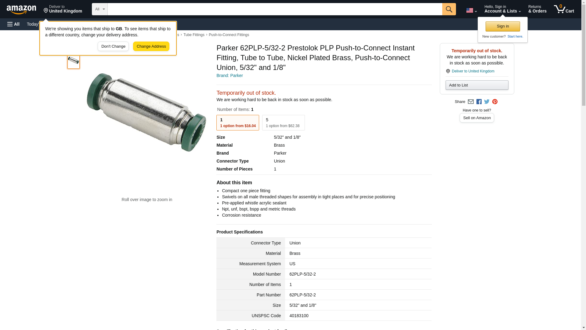 Parker 62PLP-5/32-2 Prestolok PLP Push-to-Connect Instant Fitting, Tube to Tube, Nickel Plated Brass, Push-to-Connect Union, 5/32" and 1/8"