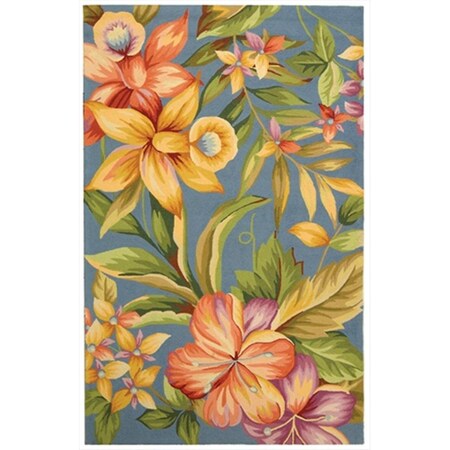 - This rug features a blue background, and displays a stunning floral pattern in shades of yellow, green, red, purple, and rust