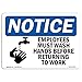 OSHA Notice Sign, NOTICE Employees Must Wash Hands Before Work, 10in X 7in Decal