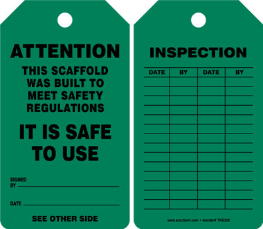 2 Set of 25 Scaffold Tags,"Attention This Scaffold was Built to Meet Safety REGULATIONS - IT is Safe to USE", 5.75" x 3.25", PF-Cardstock, Black on Green