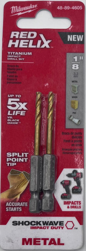 Milwaukee SHOCKWAVE Impact Duty Titanium Drill Bits with RED HELIX are engineered for impacts and drills. Designed with a Variable Helix with an aggressive 35° Helix Angle which ends at 15°, the Impact Duty Titanium Drill bits with RED HELIX provide Rapid Chip Removal to limit heat buildup to Stay Sharper Longer. The 135° split point tip delivers a precision start and prevents walking for fast, accurate holes. Titanium coating can be used in all drilling applications to give you up to 3X life vs. Black Oxide Drill Bits.