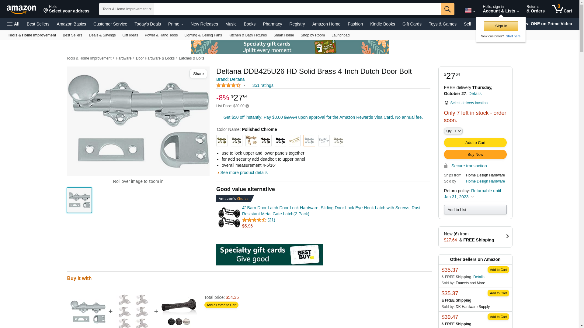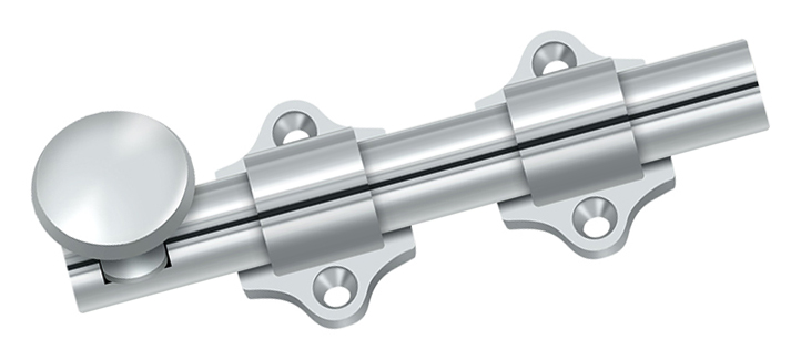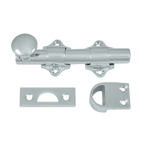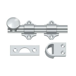 DDB425U26 Finish: Polished Chrome Features: -Material: Solid brass. -Use to lock upper and lower panels together. -Add security add deadbolt to upper panel. Door Type: -Exterior/Interior. Style: -Traditional. Product Type: -HD Dutch Door Bolt. Dimensions: Overall Height - Top to Bottom: -4.2". Overall Width - Side to Side: -1.25". Overall Depth - Front to Back: -1". Overall Product Weight: -1.1 lbs.