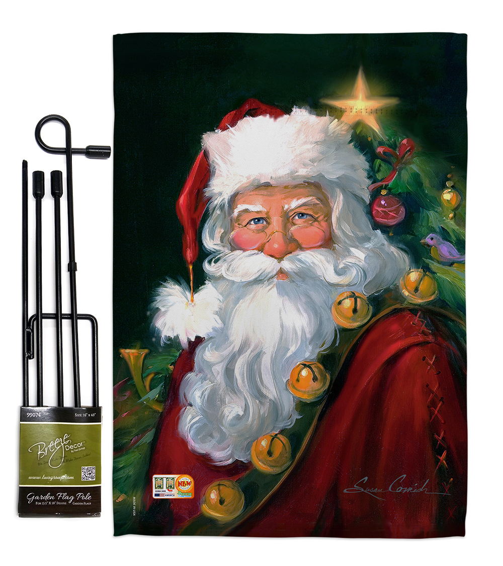 Christmas Beautiful Mini Garden Flag with Metal Garden Banner Pole Stand Complete Set Breeze Decor have variety of Garden Flag Set for all occasions Uniquely design for hanging indoor or outdoor use We are committed to offering you exceptional values Our customers enjoy displaying our Garden Flag Set for longer periods For more than a decade weve been dedicated to manufacturing flags with no comparison in quality and beautiful designs Our flags are made with our Pro Guard material that is soft to the touch and designs can be read correctly on the flag A feature that our customers will love We are committed to using ecofriendly inks that wont leave a foot print in our environment Features. Santa Portrait Winter Christmas Impressions Decorative Vertical Double Sided Garden Flag Set with Banner Pole. Proudly Printed in USAIncludes. 1 Piece x Mini Garden Flag 13 x 185. 1 Piece x 40 4 Pieces Breaks Down Metal Yard Banner StandSpecifications. Theme Christmas. Garden Flag Set Size 13 x 185. Breaks Down Garden Flag Pole Size 16 x 40. Print DoubleSided. Readable Readable Both Sides. Material Weather Resistant 3 Layers Blockout. Stitching Double Stitched. Display Vertical. Hang Type Sleeve. Artist Susan Comish. Weight 109 lbs