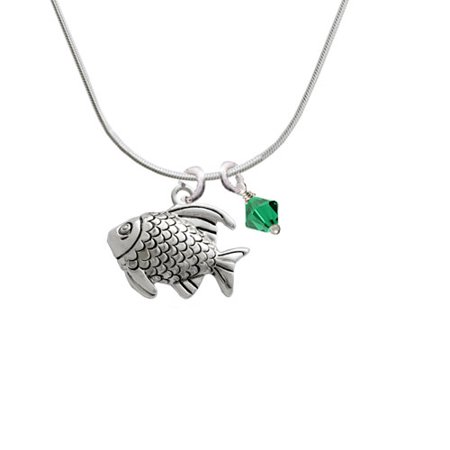 Silver Tone Antiqued Fish - Green Bicone Crystal Necklace. Silver Tone, hand enameled charms. Charm size is approx. 0.56 x 0.75 x 0.12 inches (HxWxD) including loop. 18 Inch Snake Chain Necklace with a Lobster Claw Clasp. Hand wrapped crystal bicone is approx: 6mm. We use Swarovski Crystallized Elements. Available in many colors. We are a family owned company in the U.S.A. since 1977. PLEASE NOTE: Our products are lead safe, but are not intended for children 14 years and younger.