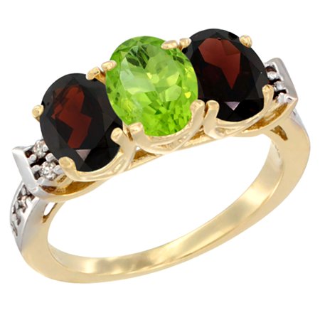 14K Yellow Gold Natural Peridot & Garnet Sides Ring 3-Stone 7x5 mm Oval Diamond Accent, sizes 5 - 10