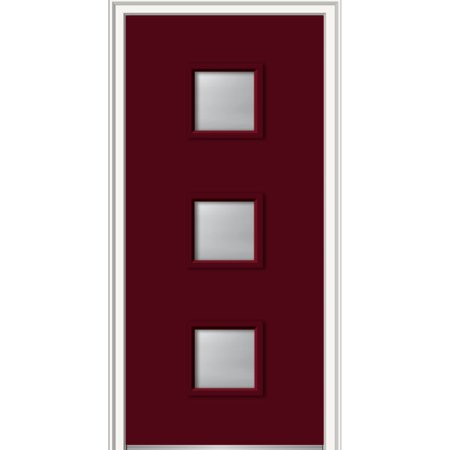 <ul> <li>Door Size: 30"x80"</li> <li>Unit Dimension: 31.5"x81.75"</li> <li>Suggested Rough Opening: 32"x82.25"</li> <li>Fiberglass Smooth</li> <li>6-9/16" Primed Composite Frame</li> <li>3-Lite Square</li> <li>Frosted Glass; Privacy Rating 9 out of 10</li> <li>Door Prefinished Burgundy</li> <li>Left Hand In-Swing</li> <li>Left Hand In-Swing Door Handing - Standing on the inside of your home, if your hinge pins are on your right, you have a Left Hand In-Swing</li> <li>3 Satin Nickel Hinges - 2-1/8" Entry/Deadbolt Bore Prep - *Locks Sold Separately*</li> <li>Brickmould Applied</li> </ul>