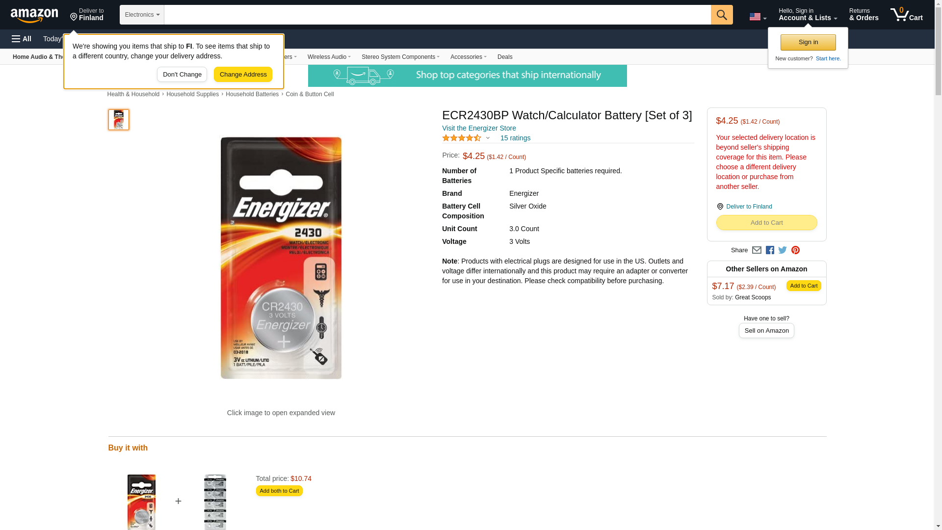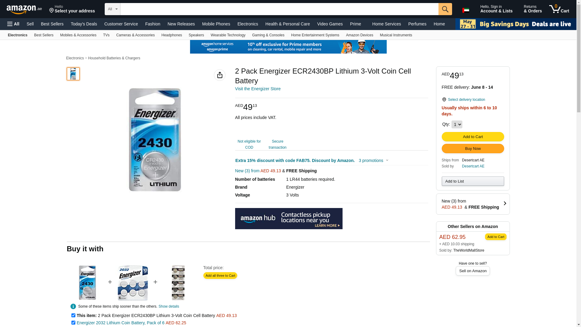 | BatteryJunction.com | ENERGIZER-ECR2430BP | 1 | 1 | 1 @ $2.25 | |