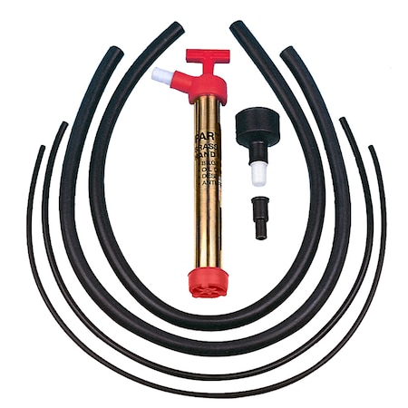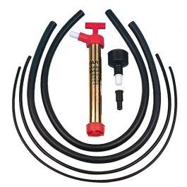A versatile, polished brass, multi-purpose hand pump. Drain, fill or top up engine and gearbox oil. Overcomes problem of hard to reach drain plugs and filler caps. Oil and corrosion resistant brass neoprene construction with up to 1-1/2 gpm output. Connection for 1/2" ID hose. Foot adapter for 1/2" ID hose. Two 1/2" ID hoses, one 5/16" probe, and one 1/4" probe. Not made for pumping gasoline or other flammable liquids.