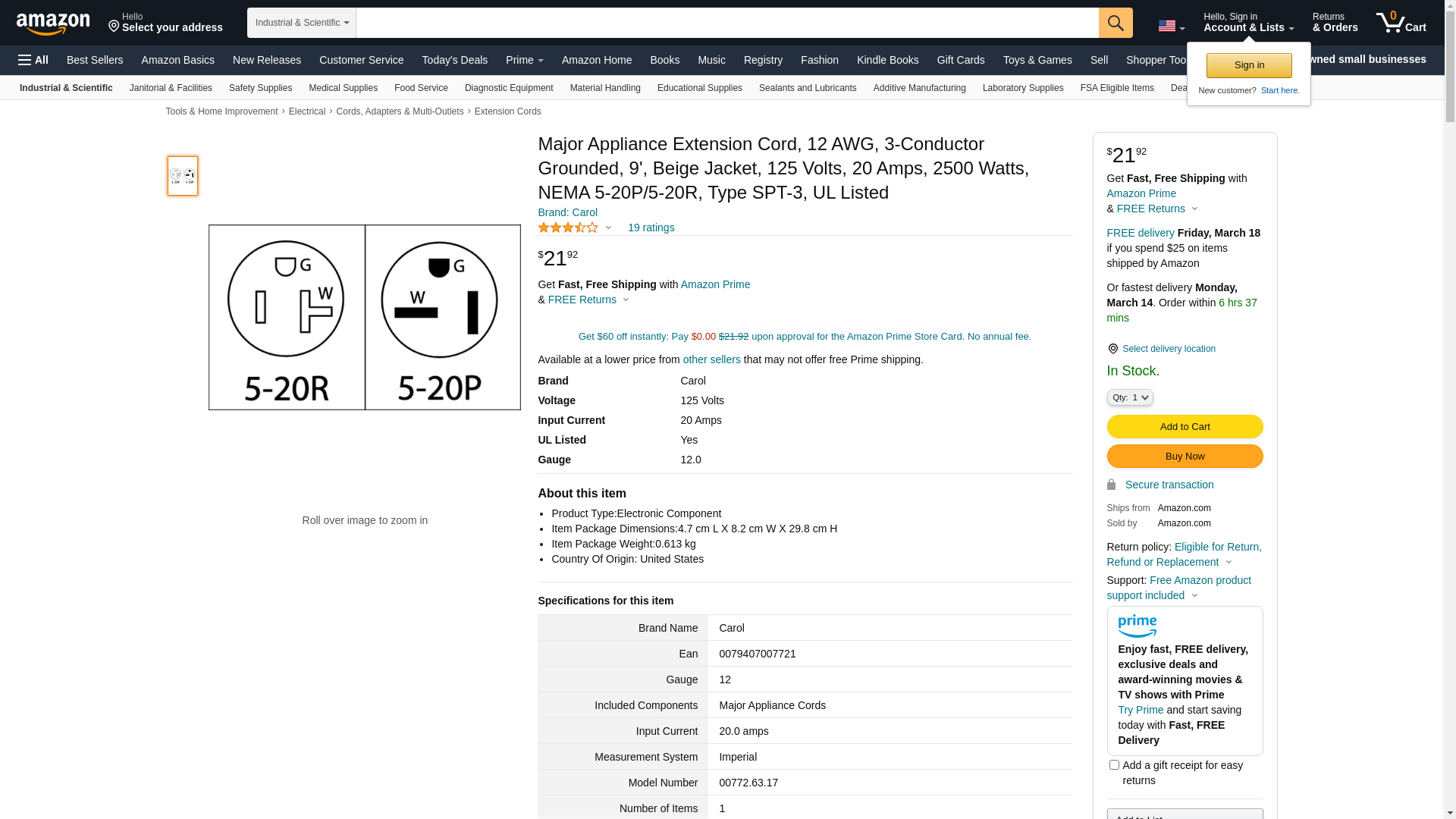 Major Appliance Extension Cord, 12 AWG, 3-Conductor Grounded, 9', Beige Jacket, 125 Volts, 20 Amps, 2500 Watts, NEMA 5-20P/5-20R, Type SPT-3, UL Listed