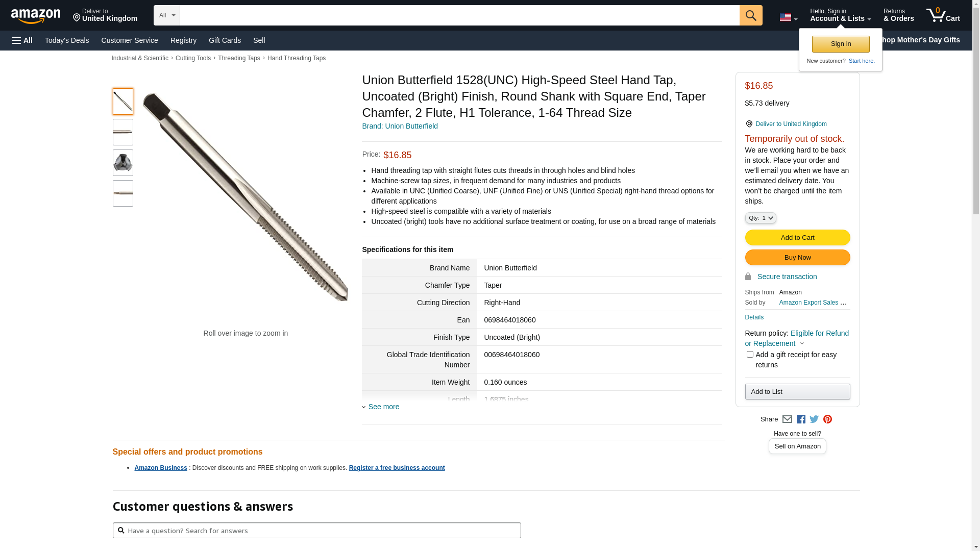Union Butterfield 1528(UNC) High-Speed Steel Hand Tap, Uncoated (Bright) Finish, Round Shank with Square End, Taper Chamfer, 2 Flute, H1 Tolerance, 1-64 Thread Size