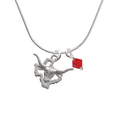 Silver Tone Longhorn - Texas - Red Bicone Crystal Necklace. Silver Tone, hand enameled charms. Charm size is approx. 0.77 x 0.88 x 0.1 inches (HxWxD) including loop. 18 Inch Snake Chain Necklace with a Lobster Claw Clasp. Hand wrapped crystal bicone is approx: 6mm. We use Swarovski Crystallized Elements. Available in many colors. We are a family owned company in the U.S.A. since 1977. PLEASE NOTE: Our products are lead safe, but are not intended for children 14 years and younger.