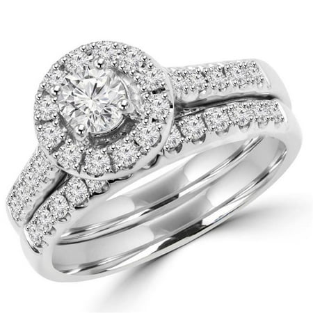 <p>When the engagement ring is so spectacular, why wouldn't you want to pair it with its matching wedding band Express your undying love with this stunning 1 CTW Diamond Halo Bridal set in 14K White Gold. There will be no doubt in their mind that they've made the right choice. </p> <p>When you're sure that your love was built to last, this eye-catching diamond halo bridal set will be the perfect way to show your sweetheart that you are ready to take the next step. The center round cut diamond weighs 0.30 CT and the round diamond accents weigh 0.70 CTW. The color rating is G-H, with a clarity range of VS2-SI1. The metal weight is 4.9 grams. </p> <b>Features</b> <ul> <li>69 remarkable stones.</li> <li>A bridal set infused with romance and beauty.</li> <li>Durable materials and beautiful craftsmanship.</li> <li>14K polished white gold.</li> </ul> <b>Specifications</b> <ul> <li><b>Ring Size:</b> Size 3.5</li> <p><b>Stone Information</b></p> <li><b>Number of Stones:</b> 69</li> <li><b>Carat Total Weight (ctw):</b> 1</li> <li><b>Stone Type:</b> Diamond</li> <li><b>Stone Shape:</b> Round</li> <li><b>Cut:</b> Very Good</li> <li><b>Carat Weight:</b> 0.3</li> <li><b>Color:</b> G-H</li> <li><b>Clarity:</b> VS2-SI1</li> <li><b>Stone Type:</b> Diamond</li> <li><b>Stone Shape:</b> Round</li> <li><b>Cut:</b> Very Good</li> <li><b>Carat Weight:</b> 0.7</li> <li><b>Color:</b> G-H</li> <li><b>Clarity:</b> VS2-SI1</li> <p><b>Setting Information</b></p> <li><b>Metal:</b> 14K Gold</li> <li><b>Metal Weight:</b> 4.9 Grams</li> <li><b>Color:</b> White</li> <li><b>Finish:</b> Polished</li> <li><b>Setting Type:</b> Prong</li> </ul>- SKU: MJTD38679