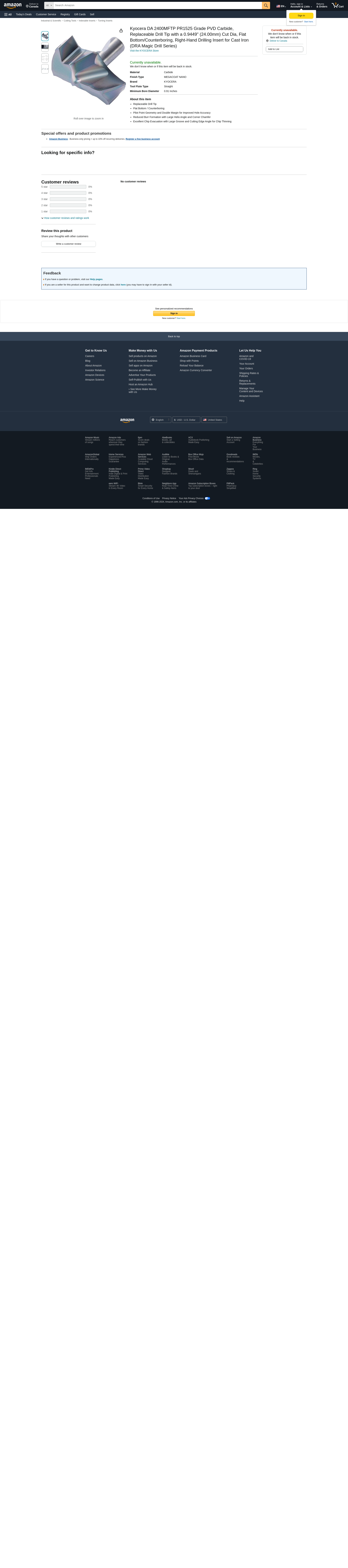 Kyocera DA 2400MFTP PR1525 Grade PVD Carbide, Replaceable Drill Tip with a 0.9449" (24.00mm) Cut Dia, Flat Bottom/Counterboring, Right-Hand Drilling Insert for Cast Iron (DRA Magic Drill Series)