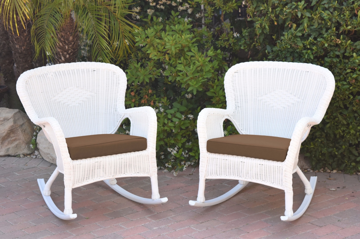 Jeco W00213-R-2-FS007 Windsor White Resin Wicker Rocker Chair with Brown Cushion - Set of 2