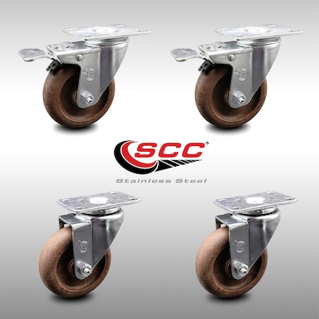 Stainless Steel High Temp Glass Filled Nylon Swivel Top Plate Caster Set 4 w/4" x 1.25" Brown Wheels-Includes 2 Swivel with Total Locking Brakes & 2 Swivel-1400 lbs Total Capacity-Service Caster Brand