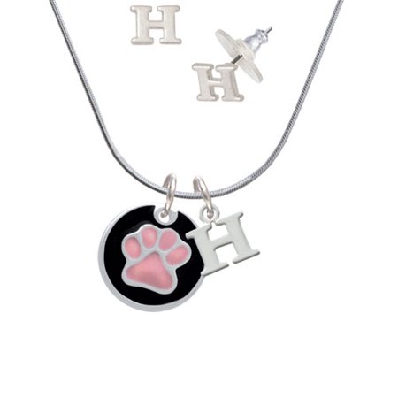 Silver Tone 3/4" Pink Paw in Black Circle - - H Initial Charm Necklace and Stud Earrings Jewelry Set. Silver Tone Charm. Black is textured Silver Tone. Charm size is approx. 0.75 x 0.75 x 0.09 inches (HxWxD) including loop. Mini Initial Stud Earrings are approx. 0.28 x 0.34 inches (HxW) with steel posts. Earring backs are Bullet ''Clutch'' Style with Plastic Pad. Small Initial Pendant is approximately 0.45 inches tall including loop. 18 Inch Snake Chain Necklace with a Lobster Claw Clasp. Charming jewelry set makes a wonderful personalized gift. Featured necklace is an exclusive Delight & Co. design. We are a family owned company for over 35 years in the U.S.A. PLEASE NOTE: Our products are lead safe, but are not intended for children 14 years and younger.