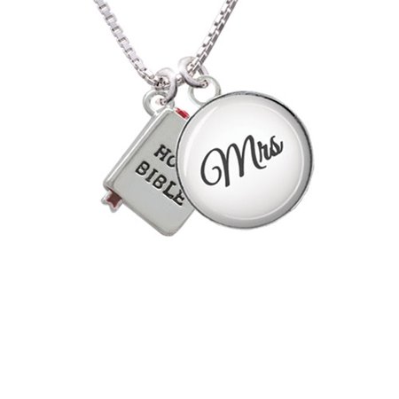 Silver Tone Bible with Cross Mrs Glass Dome Necklace. Silver Tone, hand enameled charms. Charm size is approx. 0.64 x 0.53 x 0.13 inches (HxWxD) including loop. 1.3mm Box Chain Necklace is adjustable from 18 to 20 inches. Necklace comes with lobster claw clasp and 2 inch extender chain. Lovely gift for a bridal shower, new bride, or the special woman in your life. Featured necklace is an exclusive Delight & Co. design. We are a family owned company for over 35 years in the U.S.A. PLEASE NOTE: Our products are lead safe, but are not intended for children 14 years and younger.