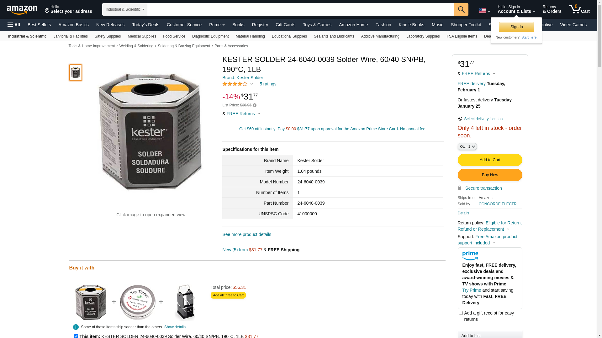 Kester Solder 24-6040-0039 Solder Wire, 60/40 SN/PB, 190°C, 1LB