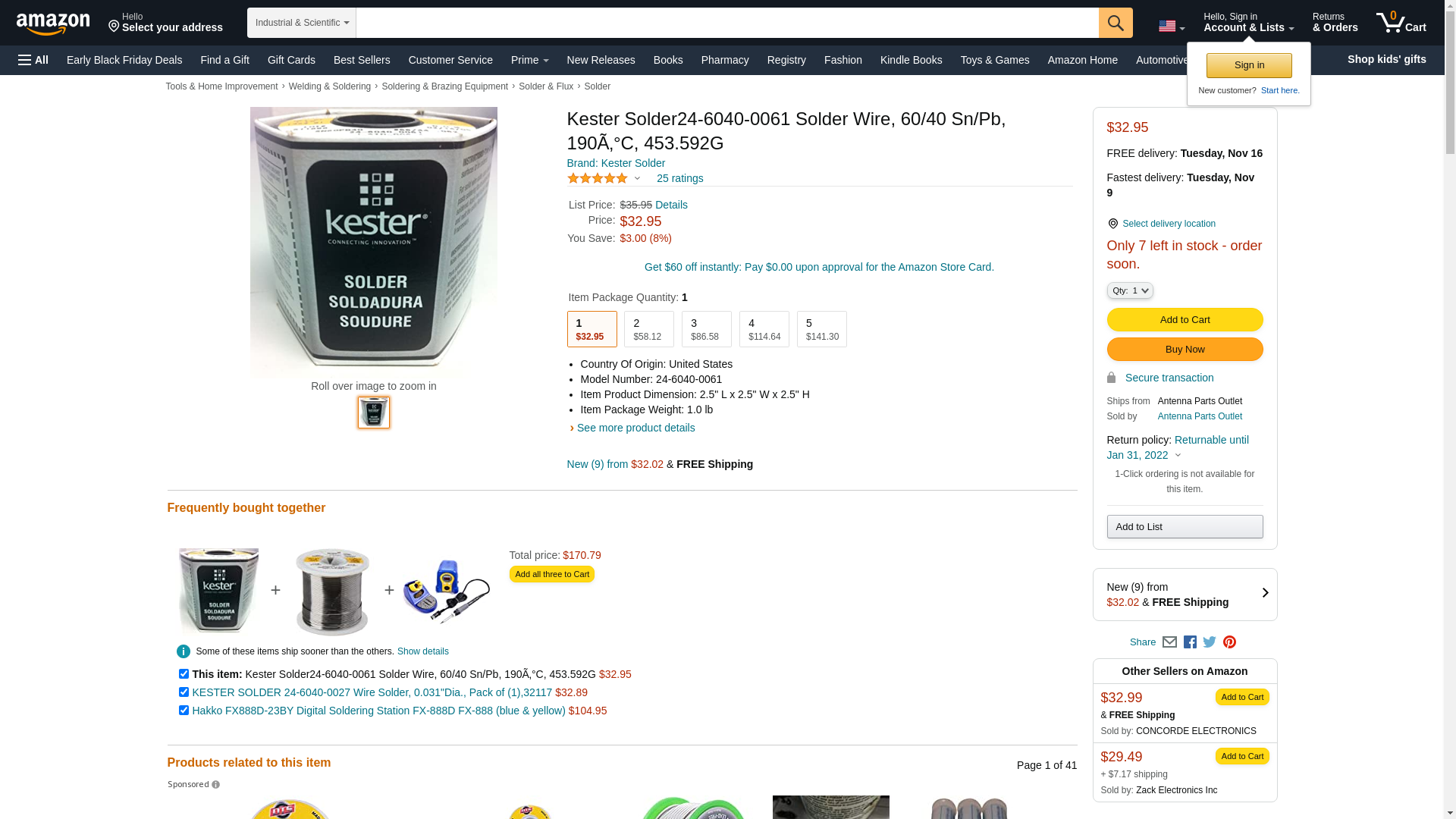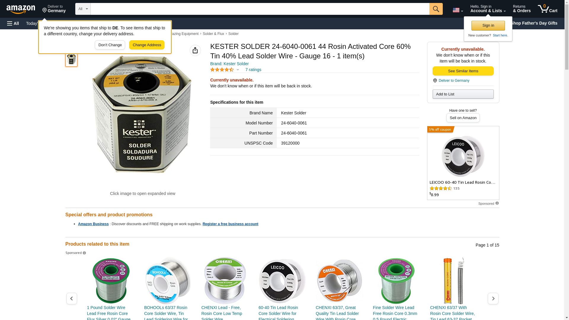Kester Solder 24-6040-0061 Solder wire, 60/40 SN/PB, 190°C, 453.592G., Country of Origin - United States, Manufacturer name - Kester Solder.