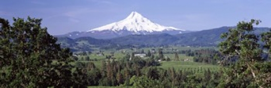 Panoramic Images PPI120766L Trees and farms with a snowcapped mountain in the background Mt Hood Oregon USA Poster Pr