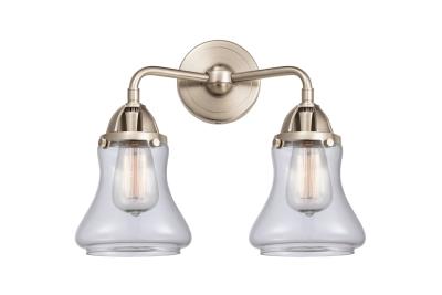 INNOVATIONS LIGHTING 288-2W-SN-G192-LED Bellmont Bath Vanity Light. Innovations Lighting Bellmont 2 Light 14 inch Brushed Satin Nickel Bath Vanity Light. Collection: Nouveau 2. Material: Steel, Cast Brass, Glass. Metal Finish(Body): Brushed Satin Nickel. Metal Finish (Canopy/Backplate): Brushed Satin Nickel. Dimension(in): 12.625(H) x 14(W) x 7.25(Ext). Maximum Wattage Per Socket: 100. Bulb: (2)3.5 Watt LED Vintage Medium Base Bulb Included. Dimmable: Yes. Color Temperature(Kelvin): 2700. Lumens: 350. Color Rendering Index(CRI): 82. Voltage: 120. Glass Shade Description: Clear Bellmont. Glass Type: Transparent. Glass or Metal Shade Shape: Bell. Glass or Metal Shade Color: Clear. Shade Material: Glass. Shade Size (Diameter x Height)(in): 6 X 6.25. Shade Fitter Measurement(in): 3.25 inch Fitter. Canopy Dimensions(in): 4.5. Backplate Dimensions(in): 4.5x0.75. Certification: UL & ETL, Damp Location.