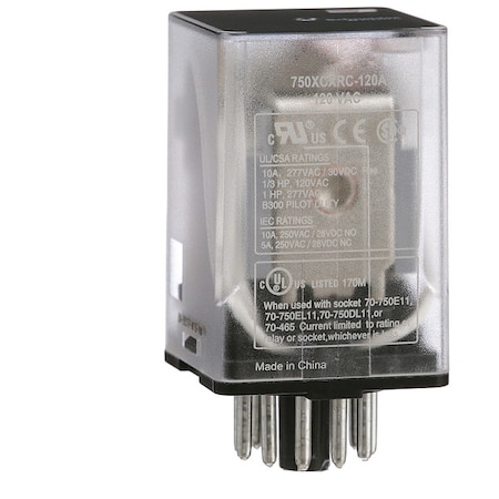 - <b>Price For:</b> Each<b>Order Unit:</b> Each 1 <b>Coil Resistance:</b>: 1.7 <b>Coil Type:</b>: - <b>Coil Voltage:</b>: 120 <b>Contact Configuration:</b>: 3PDT <b>Contact Current:</b>: 10 <b>Contact Material:</b>: Silver Alloy <b>Contact Voltage VAC:</b>: 277 <b>Contact Voltage VDC:</b>: 30 <b>Product Range:</b>: 750 Series <b>Relay Mounting:</b>: Socket <b>Relay Terminals:</b>: Quick Connect <b>Relay Type:</b>: Power - General Purpose