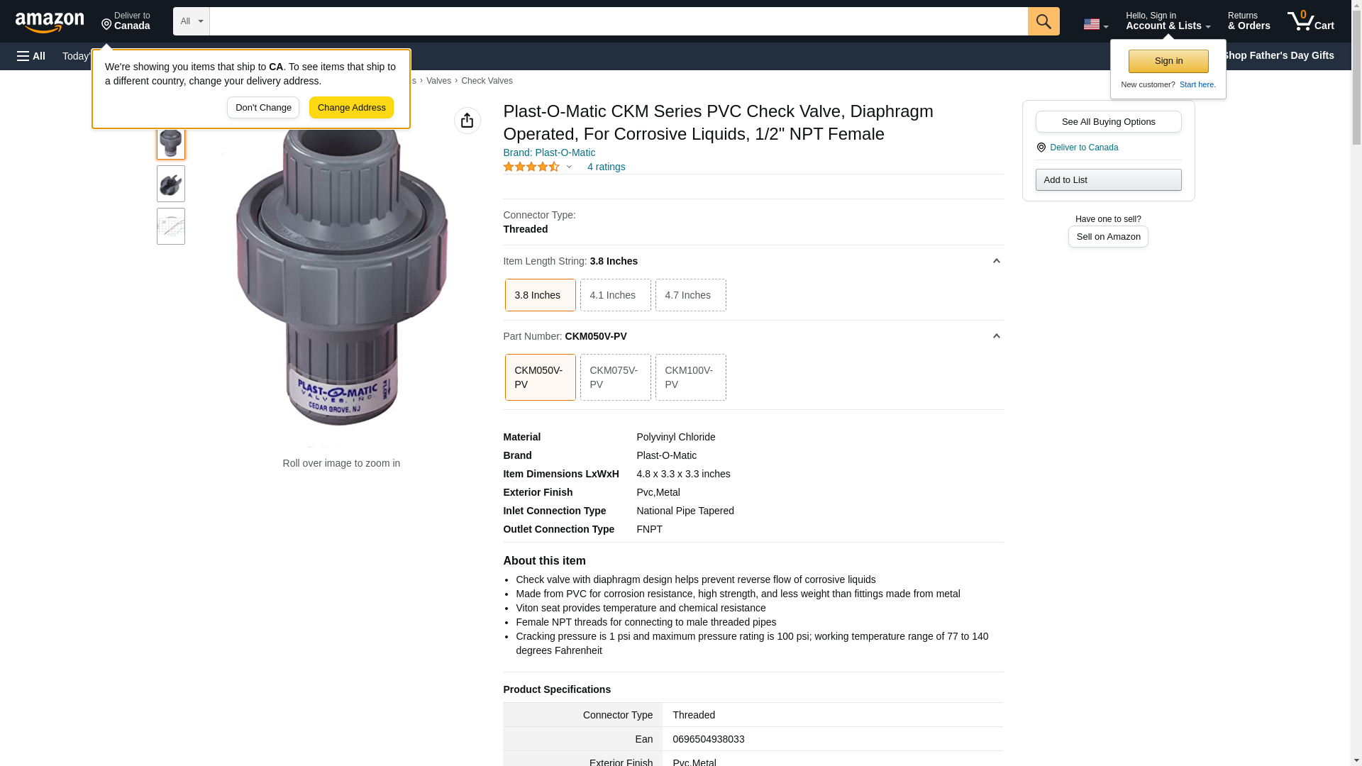 Plast-O-Matic CKM Series PVC Check Valve, Diaphragm Operated, For Corrosive Liquids, 1/2" NPT Female
